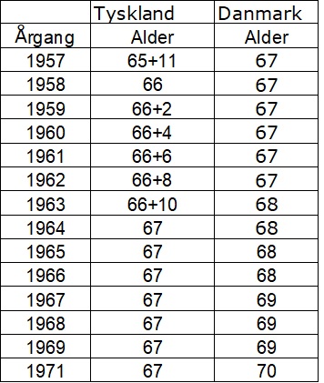 I følgende tabel kan man sammenligne pensionsalderen i Danmark og Tyskland afhængig af årgangen.
